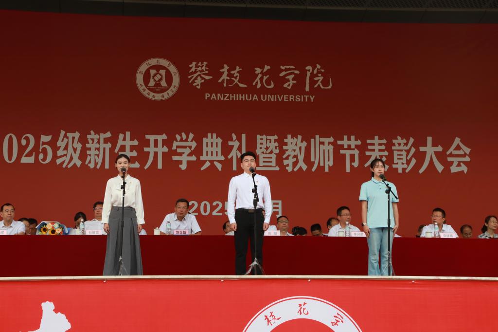 外国语学院2025级英语笔译专业硕士研究生张茜代表新生发言。她表示,作为一名新生将“归零前行、脚踏实地、融入集体、志存高远”,在阳光攀大书写“强国有我”的青春答卷。