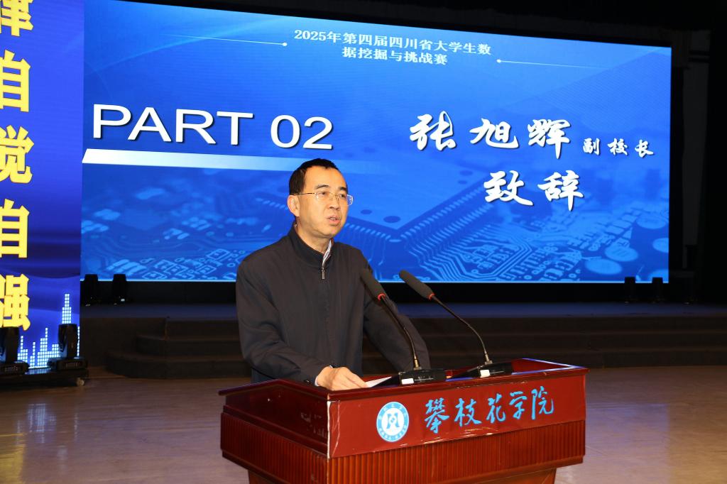 张旭辉代表承办单位致欢迎辞。他代表学校对全体嘉宾和参赛师生表示热烈欢迎。他指出,数据作为新时代的关键生产要素和基础性战略资源,其价值的挖掘与应用正深刻改变着我们的生产生活方式,驱动着社会各领域的创新发展,希望青年学子在数据海洋中探索真知,锤炼创新能力,并预祝各参赛队伍赛出水平、展现风采。他表示,学校将以承办此次大赛为契机,持续深化“产教融合、赛教融合”,积极推动信息技术与教育教学、科学研究的深度融合,为四川建设国家数字经济创新发展试验区贡献攀枝花学院力量。