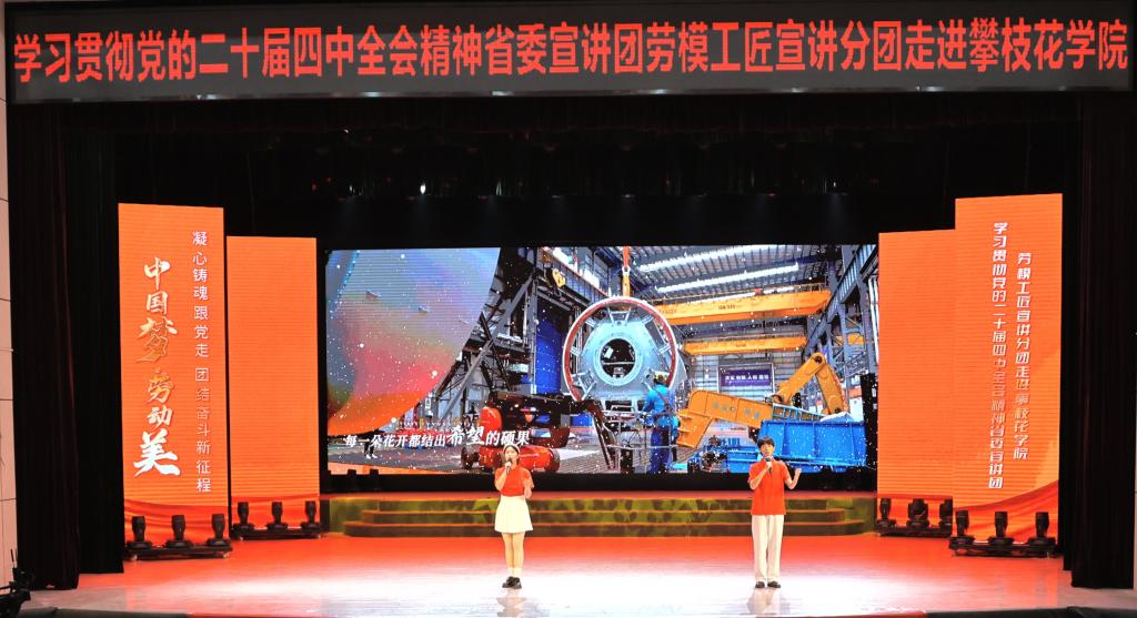 1120上午,学习贯彻党的二十届四中全会精神省委宣讲团劳模工匠宣讲分团首场主题宣讲活动在我校圆满举行,攀枝花市总工会党组成员、副主席周健,校党委副书记刘立新出席活动,校工会、马克思主义学院、学工部相关负责人参加活动。活动将党的二十届四中全会精神与劳模工匠的奋斗故事深度融合,三位来自一线的劳模工匠以奋斗故事为载体,将全会精神融入生动宣讲,为近千名师生送上了一堂别开生面的“成长思政课”。