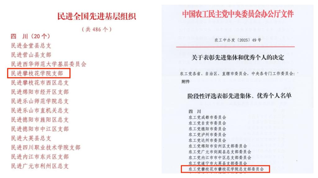 12月,在庆祝中国民主促进会成立80周年之际,民进攀枝花学院支部荣获“民进全国先进基层组织”称号。在庆祝中国农工民主党成立95周年之际,农工党攀枝花学院总支获评“基层组织先进集体”。两项荣誉是对学校统战工作的高度认可,未来将继续深化思想政治引领,夯实组织基础,提升履职能力,为学校发展、区域进步和多党合作事业贡献力量。