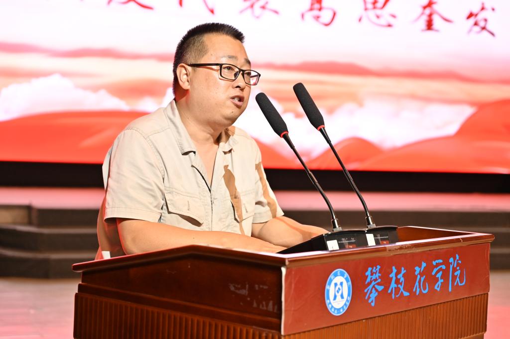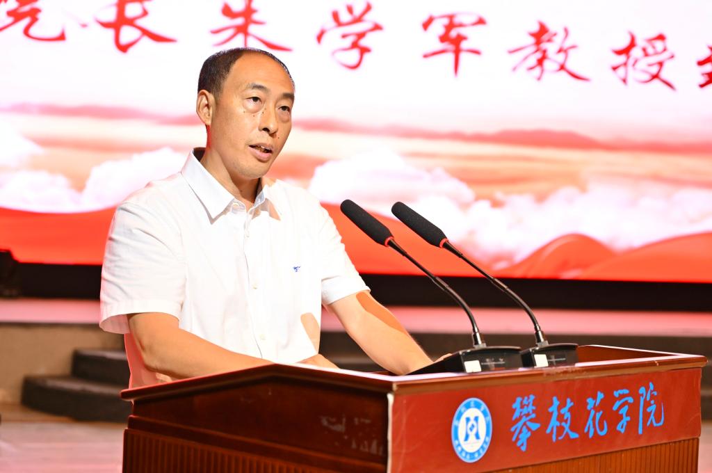 学院院长朱学军讲话,他向全体新生介绍了攀枝花历史文化和时代背景、学校发展历程、学院的学习环境和科研平台,他希望在大学四年大家用好这些平台和资源。他鼓励同学们在大学期间:要喜欢一项运动、参加一项学科竞赛、参加一项学科竞赛、考一回研究生、参加一项社会实践、参加一项科研训练,用“六个一”来丰富大学生活。