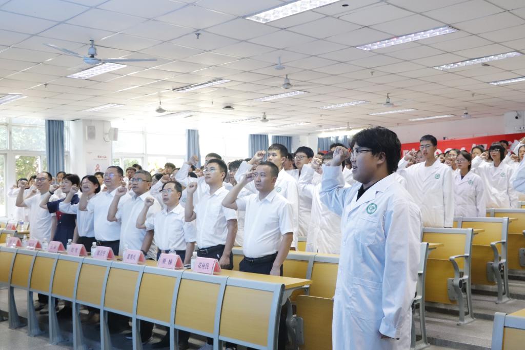 新生们庄严宣誓医学生誓言:“健康所系,性命相托……”誓言铿锵有力,表达了他们为医学事业奋斗终生的决心和信念。