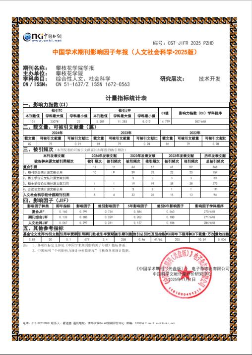 近日,中国知网公布了《中国学术期刊影响因子年报(人文社会科学·2025版)》。《攀枝花学院学报》复合影响因子0.791,同比增长43%;综合影响因子0.386,同比增长42%;影响力指数学科排名307位,提升159位,首次位于Q2区(前50%);CI学科排序、基金论文比、他引总引比、WEB即年下载率等其他指标也有明显提升。