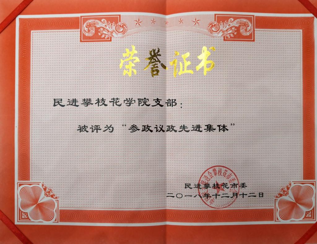 为鼓励和宣传民进基层组织参政议政优秀成果,激励广大民进会员更加积极主动投身参政议政工作。2018年12月,民进攀枝花市委开展了先进参政议政集体的表彰活动,我校民进支部被评为“参政议政先进集体”。